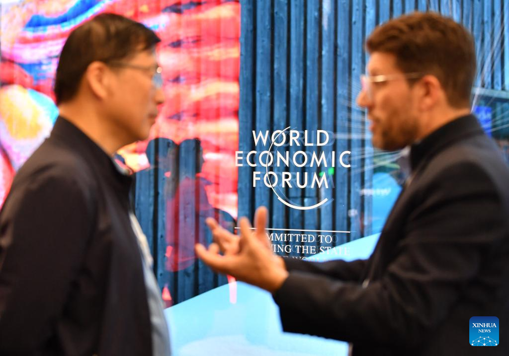 People talk at the Congress Center for the World Economic Forum (WEF) Annual Meeting 2024 in Davos, Switzerland, Jan. 14, 2024. On the theme of "Rebuilding Trust," the 54th WEF Annual Meeting will take place here from Jan. 15 to Jan. 19. The main topics at the forum range from achieving security and cooperation in a divided world, creating jobs and growth for a new era to a long-term strategy for climate, nature and energy. (Xinhua/Lian Yi)