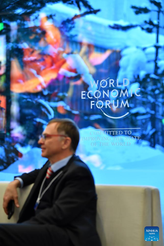 A participant awaits the opening of the World Economic Forum (WEF) Annual Meeting 2024 in Davos, Switzerland, Jan. 14, 2024. On the theme of "Rebuilding Trust," the 54th WEF Annual Meeting will take place here from Jan. 15 to Jan. 19. The main topics at the forum range from achieving security and cooperation in a divided world, creating jobs and growth for a new era to a long-term strategy for climate, nature and energy. (Xinhua/Lian Yi)