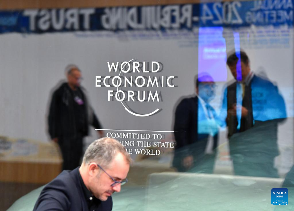 People are seen at the Congress Center for the World Economic Forum (WEF) Annual Meeting 2024 in Davos, Switzerland, Jan. 14, 2024. On the theme of "Rebuilding Trust," the 54th WEF Annual Meeting will take place here from Jan. 15 to Jan. 19. The main topics at the forum range from achieving security and cooperation in a divided world, creating jobs and growth for a new era to a long-term strategy for climate, nature and energy. (Xinhua/Lian Yi)