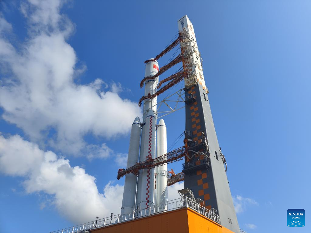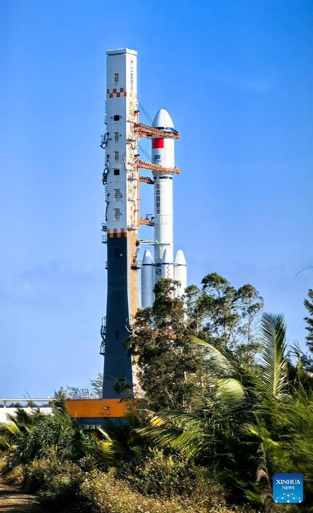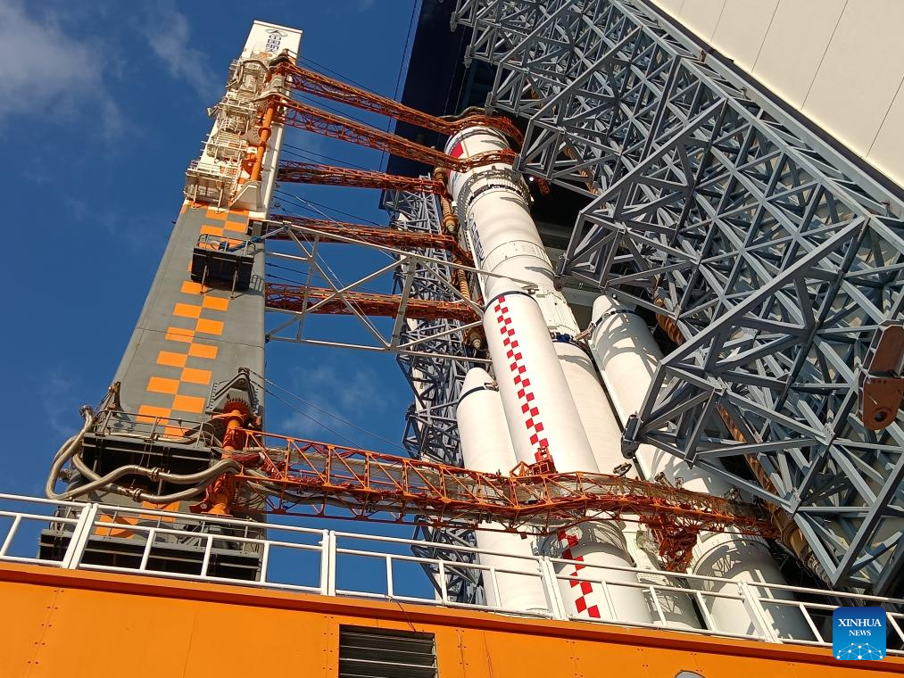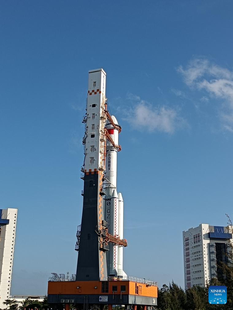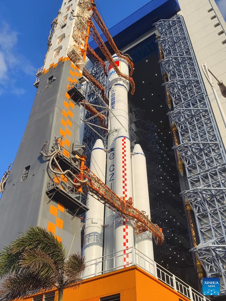 WENCHANG, Hainan, Jan. 15 (Xinhua) -- The combination of the Tianzhou-7 cargo spacecraft and a Long March-7 Y8 carrier rocket was vertically transferred to the launching area on Monday.