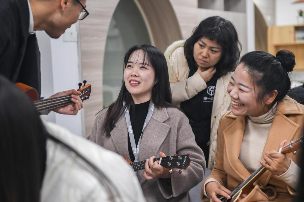 Instructor Wang Kuolin (1st L) teaches students how to play the ukulele during a night school class in Hanyang District of Wuhan, central China's Hubei Province, Jan. 10, 2024. (Xinhua/Du Zixuan)