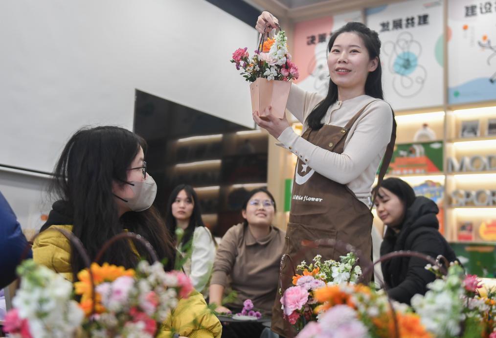 Instructor Huang Shasha teaches floral art during a night school class in Wuhan East Lake High-tech Development Zone of Wuhan, central China's Hubei Province, Jan. 14, 2024. (Xinhua/Du Zixuan)