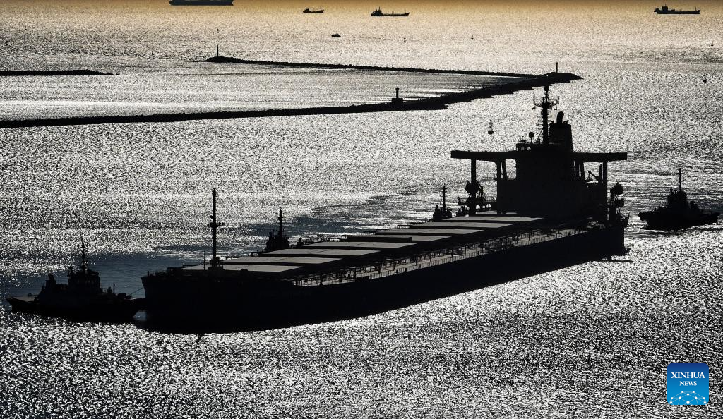 An aerial drone photo taken on Jan. 15, 2024 shows a ship being towed towards a coal terminal of Tangshan Port in north China's Hebei Province. In 2023, the cargo throughput at Tangshan Port surpassed 842.17 million tonnes, up 9.53 percent year on year, according to port authorities. (Xinhua/Yang Shiyao)