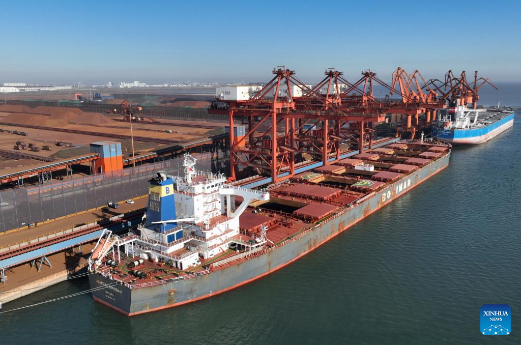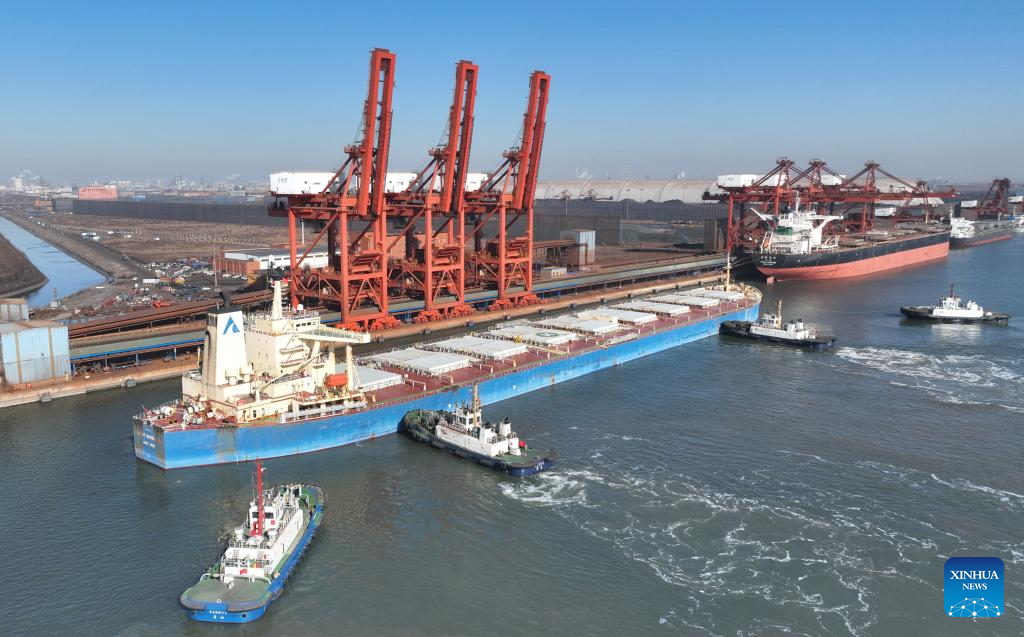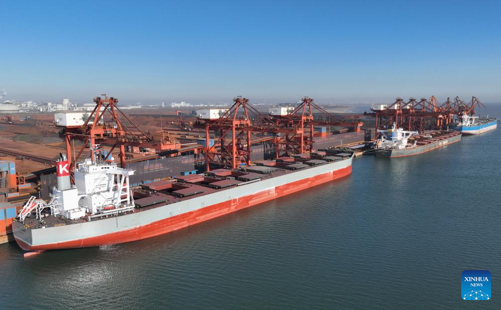 An aerial photo taken on Jan. 15, 2024 shows ships at an ore terminal of Tangshan Port in north China's Hebei Province. In 2023, the cargo throughput at Tangshan Port surpassed 842.17 million tonnes, up 9.53 percent year on year, according to port authorities. (Xinhua/Yang Shiyao)