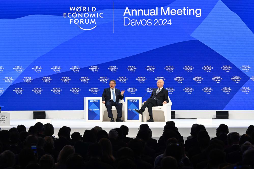 Chinese Premier Li Qiang attends the World Economic Forum (WEF) Annual Meeting 2024 hosted by Klaus Schwab, founder and executive chairman of the WEF, in Davos, Switzerland, Jan. 16, 2024. Li also delivered a special address to the event. (Xinhua/Rao Aimin)