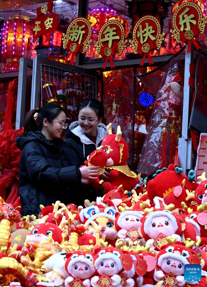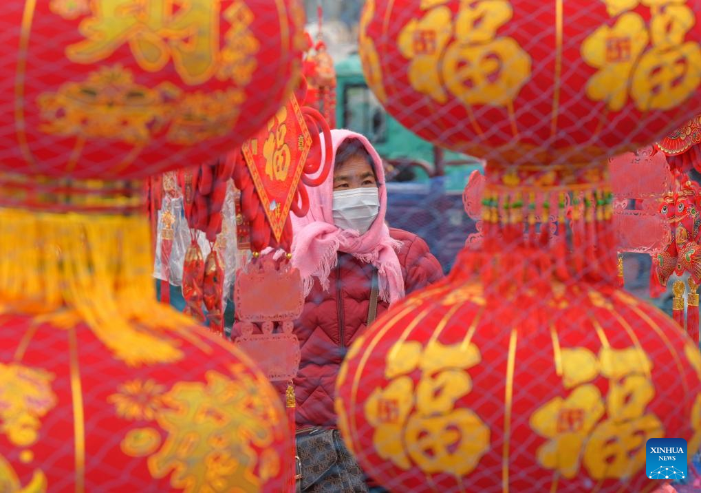 People buy decorations for the upcoming Spring Festival at a market in Shijiazhuang City, north China's Hebei Province, Jan. 16, 2024. Various events are held across the country in celebration of the upcoming Chinese Lunar New Year, which falls on Feb. 10 this year. (Photo by Chen Qibao/Xinhua)
