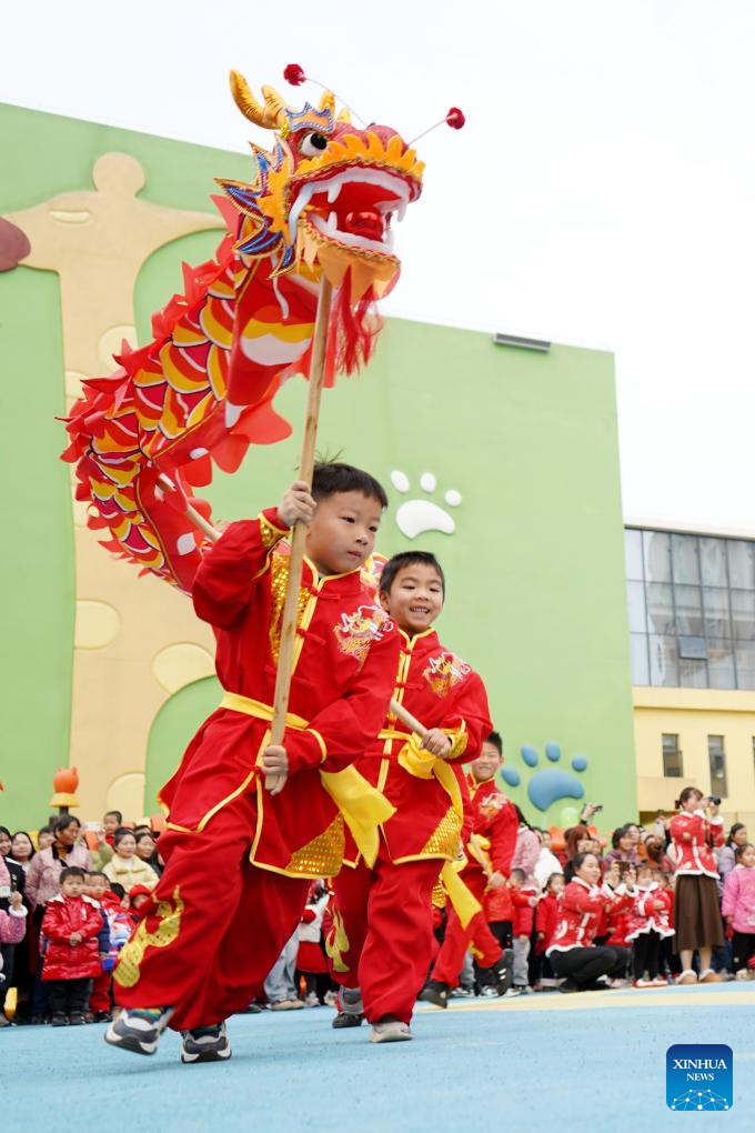Kindergarten children perform dragon dance in Yichun City, east China's Jiangxi Province, Jan. 16, 2024. Various events are held across the country in celebration of the upcoming Chinese Lunar New Year, which falls on Feb. 10 this year. (Photo by Chen Qihai/Xinhua)
