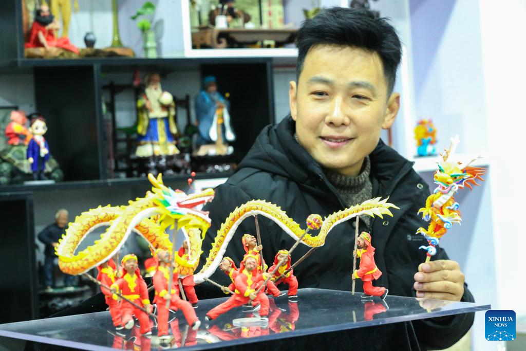 An artist displays dough figurines, a traditional Chinese folk art, in Zhumadian City, central China's Henan Province, Jan. 16, 2024. Various events are held across the country in celebration of the upcoming Chinese Lunar New Year, which falls on Feb. 10 this year. (Photo by Gong Huajing/Xinhua)
