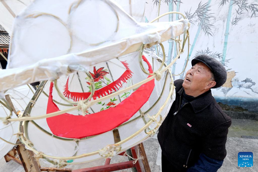 A villager makes dragon lantern in Fatou Village of Deqing County in Huzhou City, east China's Zhejiang Province, Jan. 16, 2024. Various events are held across the country in celebration of the upcoming Chinese Lunar New Year, which falls on Feb. 10 this year. (Photo by Xie Shangguo/Xinhua)