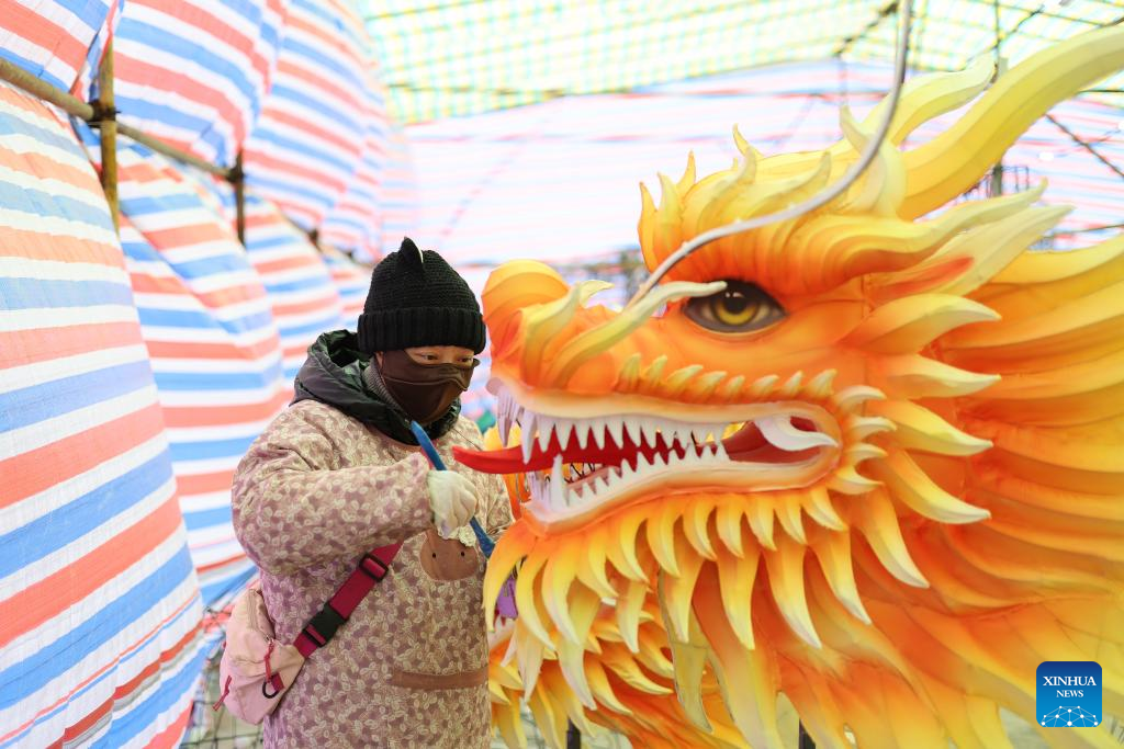 A worker makes a dragon lantern in Hongze District of Huai'an in east China's Jiangsu Province, Jan. 16, 2024. Various events are held across the country in celebration of the upcoming Chinese Lunar New Year, which falls on Feb. 10 this year. (Photo by Wan Zhen/Xinhua)