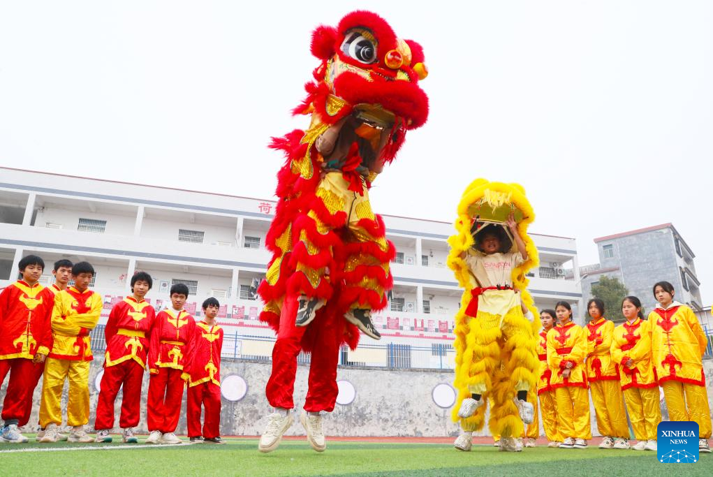 Students practice lion dance at a school in Xintian County of Yongzhou City, central China's Hunan Province, Jan. 15, 2024. Various events are held across the country in celebration of the upcoming Chinese Lunar New Year, which falls on Feb. 10 this year. (Photo by Liu Guixiong/Xinhua)