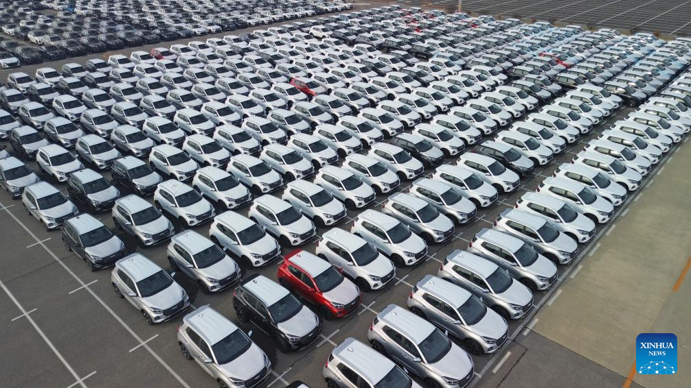 An aerial drone photo taken on Jan. 16, 2024 shows vehicles at a terminal of Dalian Port, northeast China's Liaoning Province. Dalian Port achieved a record-breaking annual export of 102,773 vehicles in 2023, marking a year-on-year growth of 143 percent, according to the Dalian Customs. (Xinhua/Chen Wei)