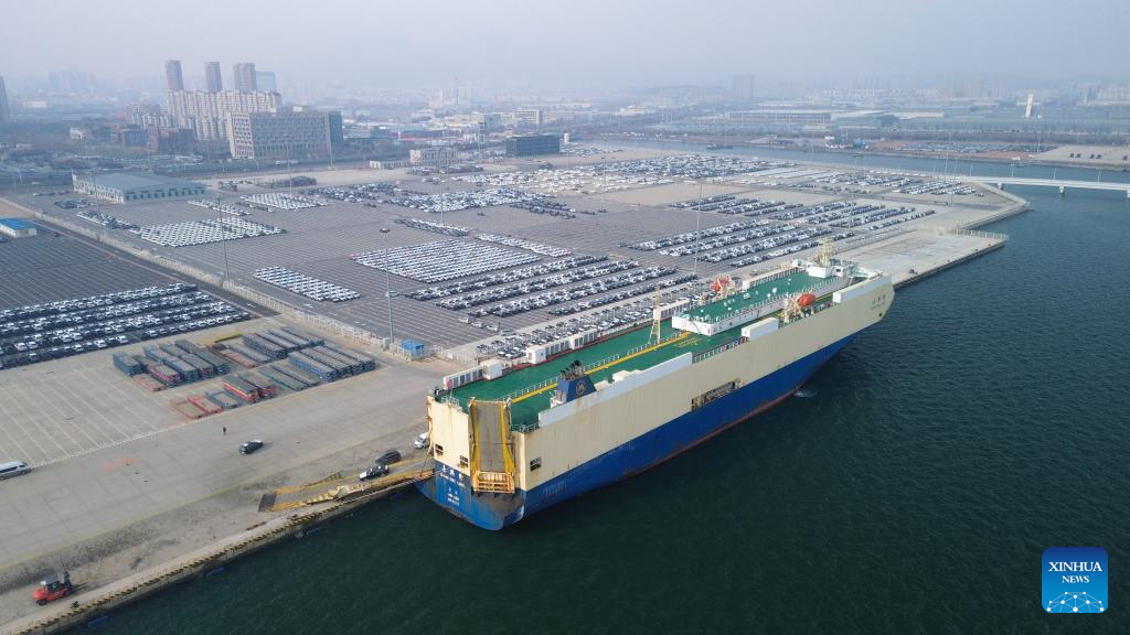 An aerial drone photo taken on Jan. 16, 2024 shows vehicles and a ro-ro ship at a terminal of Dalian Port, northeast China's Liaoning Province. Dalian Port achieved a record-breaking annual export of 102,773 vehicles in 2023, marking a year-on-year growth of 143 percent, according to the Dalian Customs. (Xinhua/Chen Wei)