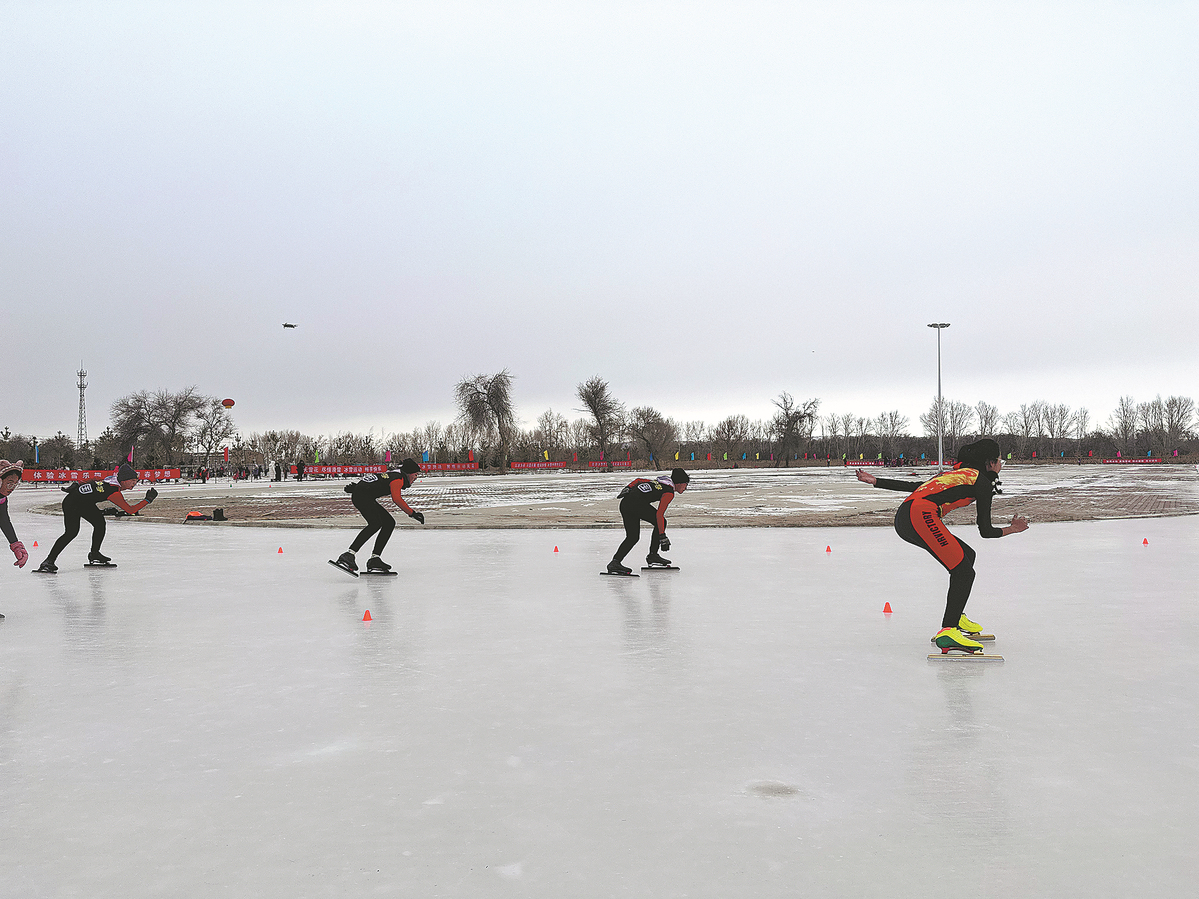 Students practice speed skating on a rink run by the 181st Regiment Middle School in Beitun, Xinjiang Uygur autonomous region. YAN DONGJIE/CHINA DAILY