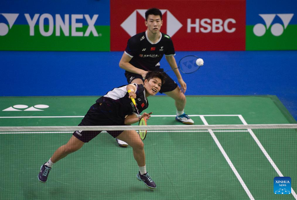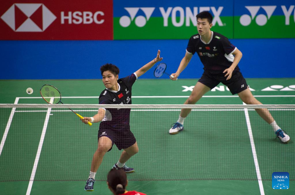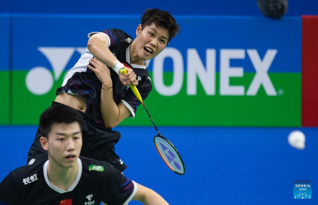 Huang Dong Ping (L) and Feng Yan Zhe of China compete during the mixed doubles match against Dejan Ferdinansyah and Gloria Emanuelle Widjaja of Indonesia at the India Open 2024 badminton tournament in New Delhi, India, Jan. 16, 2024. (Xinhua/Javed Dar)
