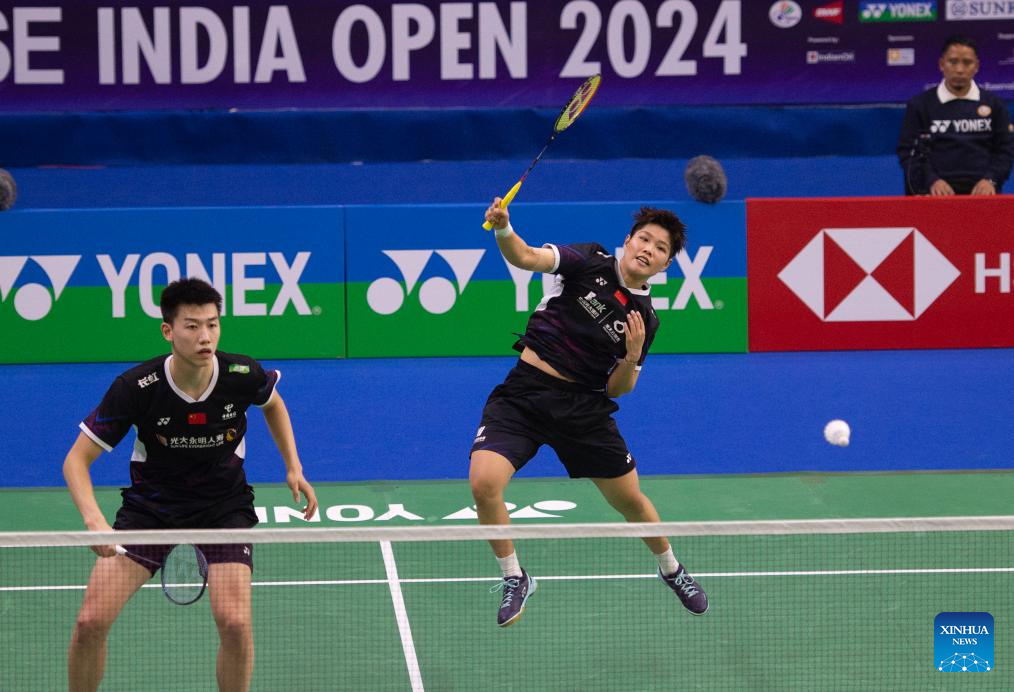 Huang Dong Ping (front) and Feng Yan Zhe of China compete during the mixed doubles match against Dejan Ferdinansyah and Gloria Emanuelle Widjaja of Indonesia at the India Open 2024 badminton tournament in New Delhi, India, Jan. 16, 2024. (Xinhua/Javed Dar)
