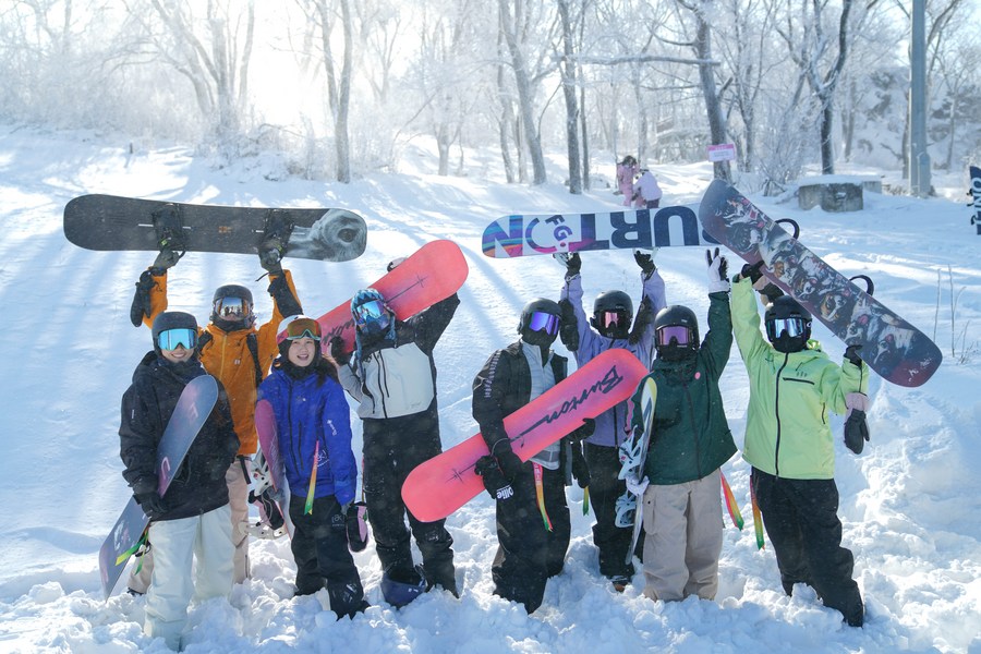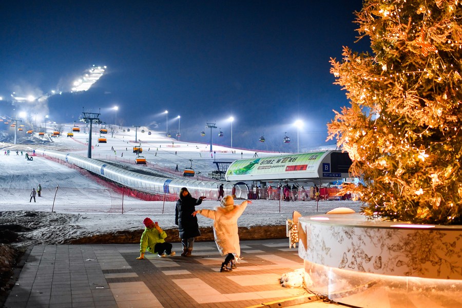 This photo taken on Dec. 14, 2023 shows people posing for photos at Lake Songhua Resort in Jilin City, northeast China's Jilin Province. (Xinhua/Xu Chang)
