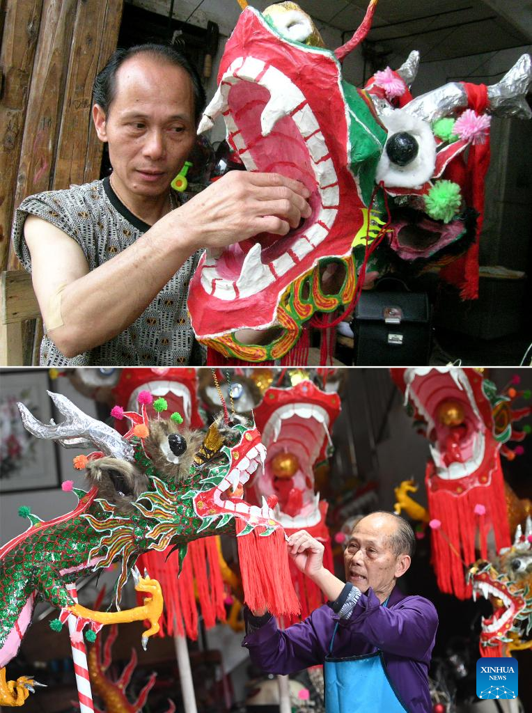This combo photo shows craftsman Zou Yute making a bamboo dragon for Firecracker Dragon Festival (Top, taken on Jan. 16, 2024) and people performing firecracker dragon dance during Firecracker Dragon Festival (Below, taken on Feb. 7, 2017) in Binyang County in south China's Guangxi Zhuang Autonomous Region. (Xinhua/Lu Boan)