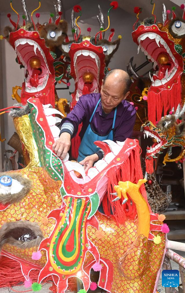 Craftsman Zou Yute shows a toy dragon he has made in Binyang County in south China's Guangxi Zhuang Autonomous Region, Jan. 16, 2024. (Xinhua/Lu Boan)