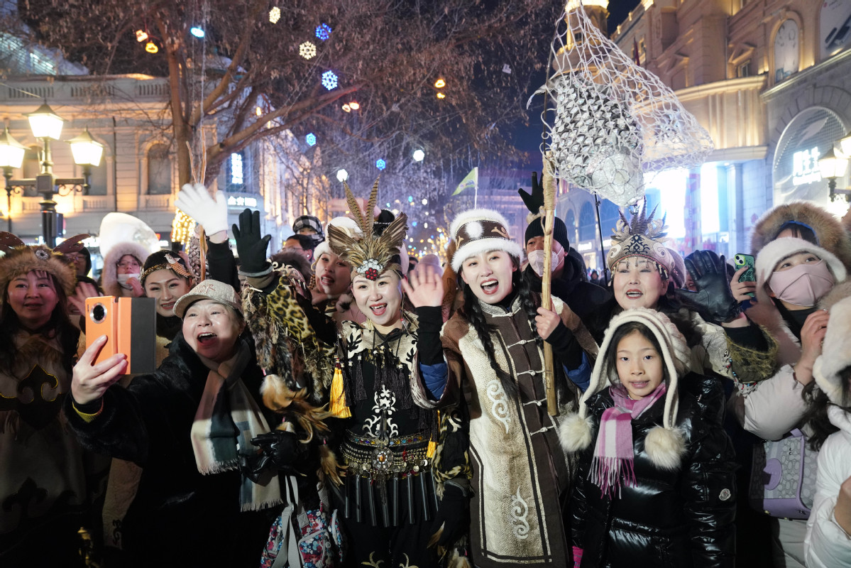 Members of the Hezhe ethnic group wearing traditional costumes, and local tourism promotion officials, interact with tourists in Harbin, on Jan 6. [Photo/Xinhua]