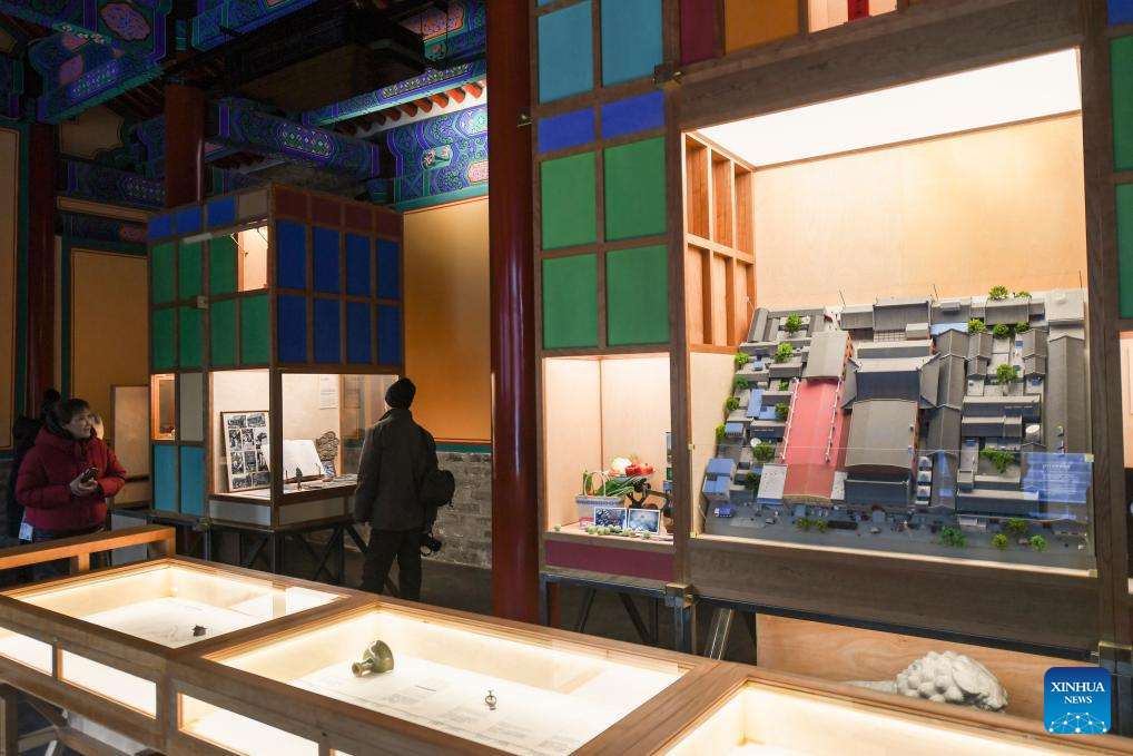 People visit an exhibition at Hong'en Temple in Beijing, capital of China, Jan. 18, 2024. The over 700-year-old Hong'en Temple opened to public recently. It is located to the north of the Bell Tower in Beijing, with Beijing Central Axis passing through its west annex hall.