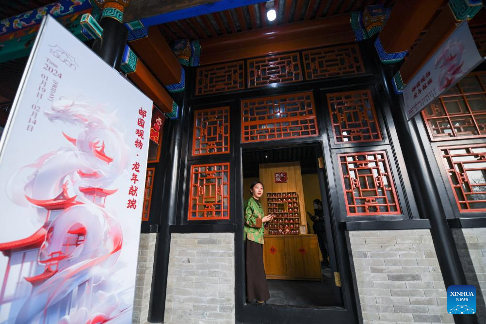 This photo taken on Jan. 18, 2024 shows a Beijing Central Axis-themed post office at Hong'en Temple in Beijing, capital of China. The over 700-year-old Hong'en Temple opened to public recently. It is located to the north of the Bell Tower in Beijing, with Beijing Central Axis passing through its west annex hall.