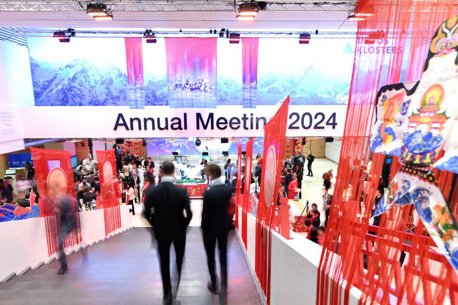 A logo of the World Economic Forum (WEF) is seen in Davos, Switzerland, Jan. 19, 2024. The WEF concluded its 2024 annual meeting here on Friday, calling to rebuild trust in the face of global uncertainty. (Xinhua/Lian Yi)