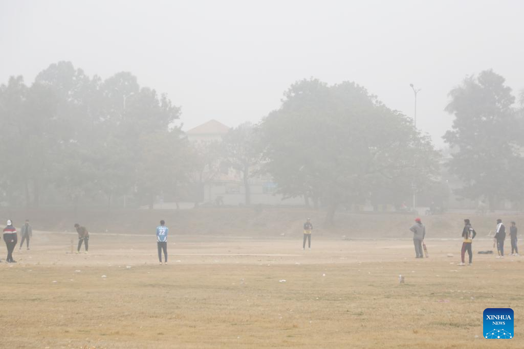 People play cricket on a foggy day in Islamabad, Pakistan, Jan. 21, 2024. A thick blanket of fog in Pakistan's federal capital Islamabad and its twin city Rawalpindi affected the daily lifestyle of the local residents starting from Friday night. (Xinhua/Ahmad Kamal)