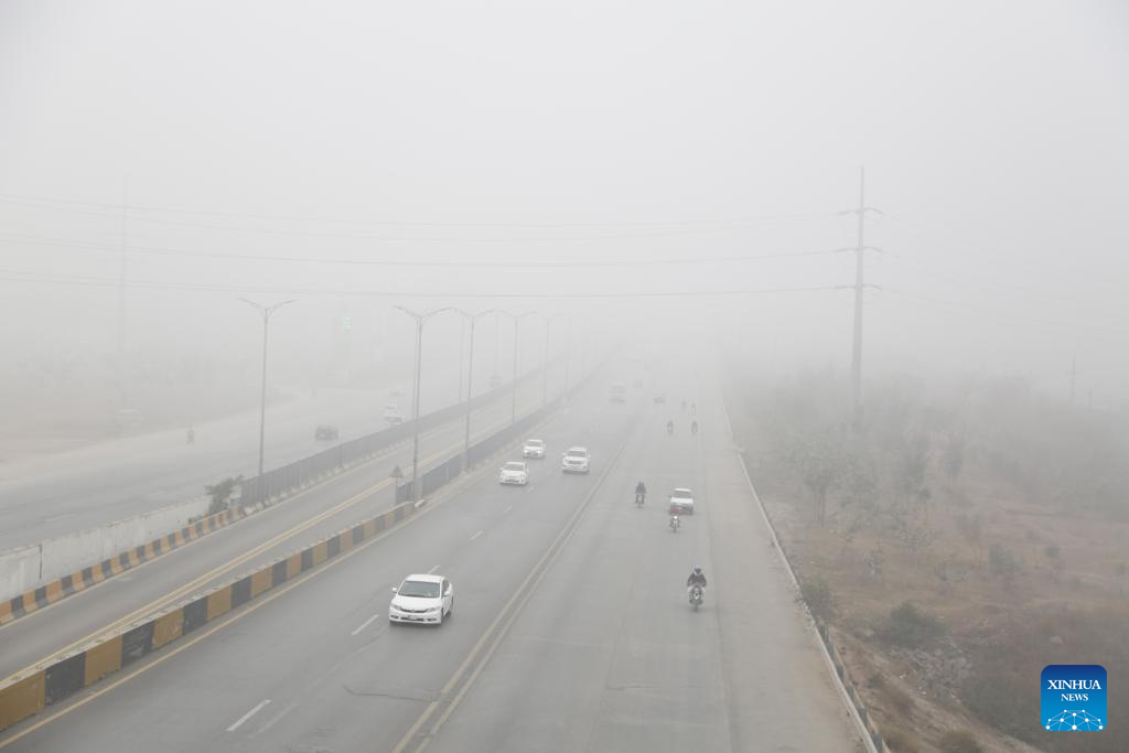 Vehicles move on a highway cloaked by fog in Islamabad, Pakistan, Jan. 21, 2024. A thick blanket of fog in Pakistan's federal capital Islamabad and its twin city Rawalpindi affected the daily lifestyle of the local residents starting from Friday night. (Xinhua/Ahmad Kamal)