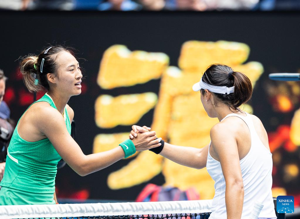 Zheng Qinwen (L) greets Wang Yafan after the women's singles 3rd round match between Zheng Qinwen and Wang Yafan of China at Australian Open tennis tournament in Melbourne, Australia, Jan. 20, 2024. (Photo by Hu Jingchen/Xinhua)