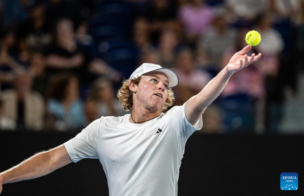 Alex Michelsen serves during the men's singles third round match between Alexander Zverev of Germany and Alex Michelsen of the United States at the Australian Open tennis tournament in Melbourne, Australia, Jan. 20, 2024. (Photo by Hu Jingchen/Xinhua)