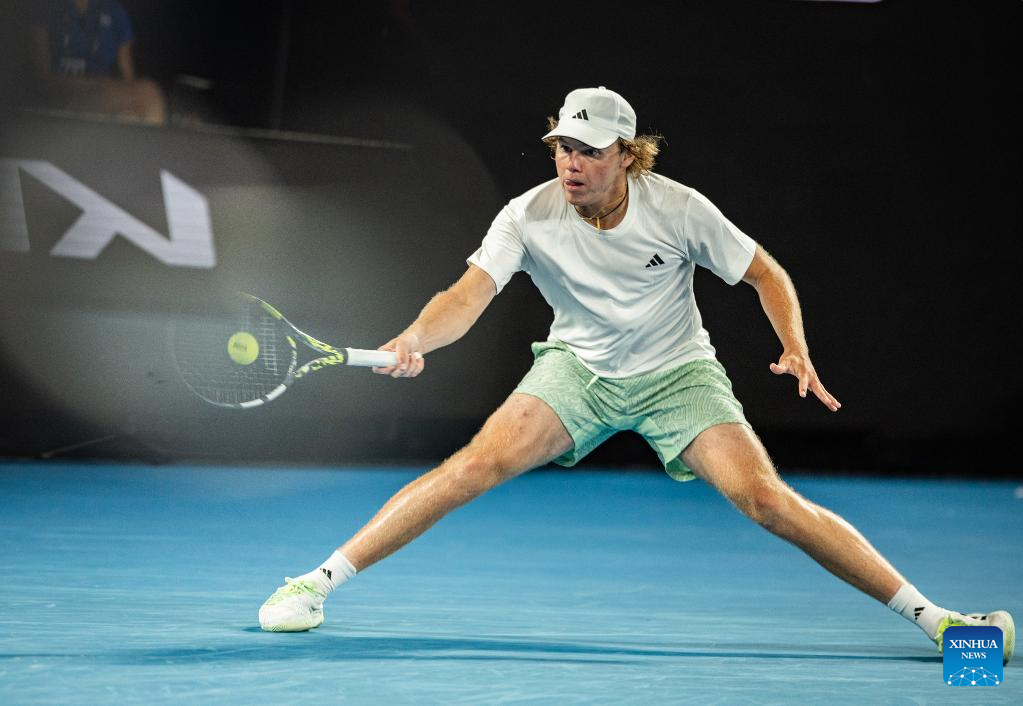 Alex Michelsen hits a return during the men's singles third round match between Alexander Zverev of Germany and Alex Michelsen of the United States at the Australian Open tennis tournament in Melbourne, Australia, Jan. 20, 2024. (Photo by Hu Jingchen/Xinhua)