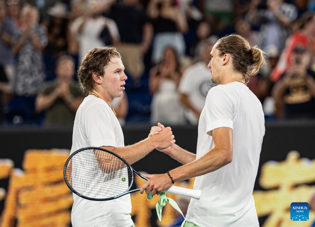 Alexander Zverev (R) of Germany shakes hands with Alex Michelsen of the United States after the men's singles third round match at the Australian Open tennis tournament in Melbourne, Australia, Jan. 20, 2024. (Photo by Hu Jingchen/Xinhua)