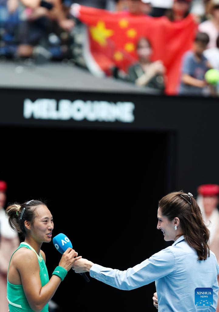 Zheng Qinwen gets interviewed after the women's singles 3rd round match between Zheng Qinwen and Wang Yafan of China at Australian Open tennis tournament in Melbourne, Australia, Jan. 20, 2024. (Xinhua/Ma Ping)