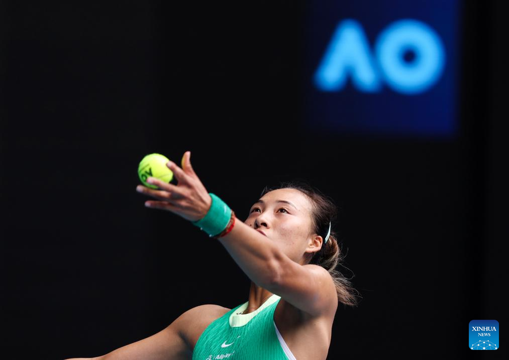 Zheng Qinwen serves during the women's singles 3rd round match between Zheng Qinwen and Wang Yafan of China at Australian Open tennis tournament in Melbourne, Australia, Jan. 20, 2024. (Xinhua/Ma Ping)