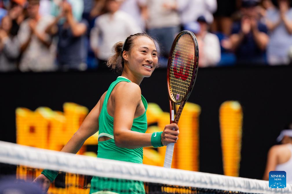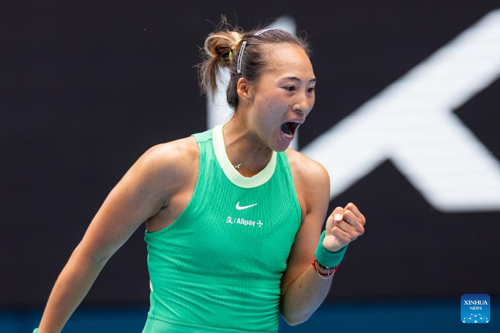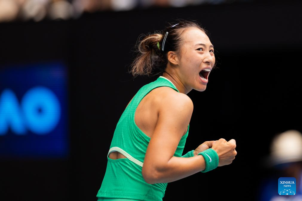 Zheng Qinwen celebrates during the women's singles 3rd round match between Zheng Qinwen and Wang Yafan of China at Australian Open tennis tournament in Melbourne, Australia, Jan. 20, 2024. (Xinhua/Ma Ping)