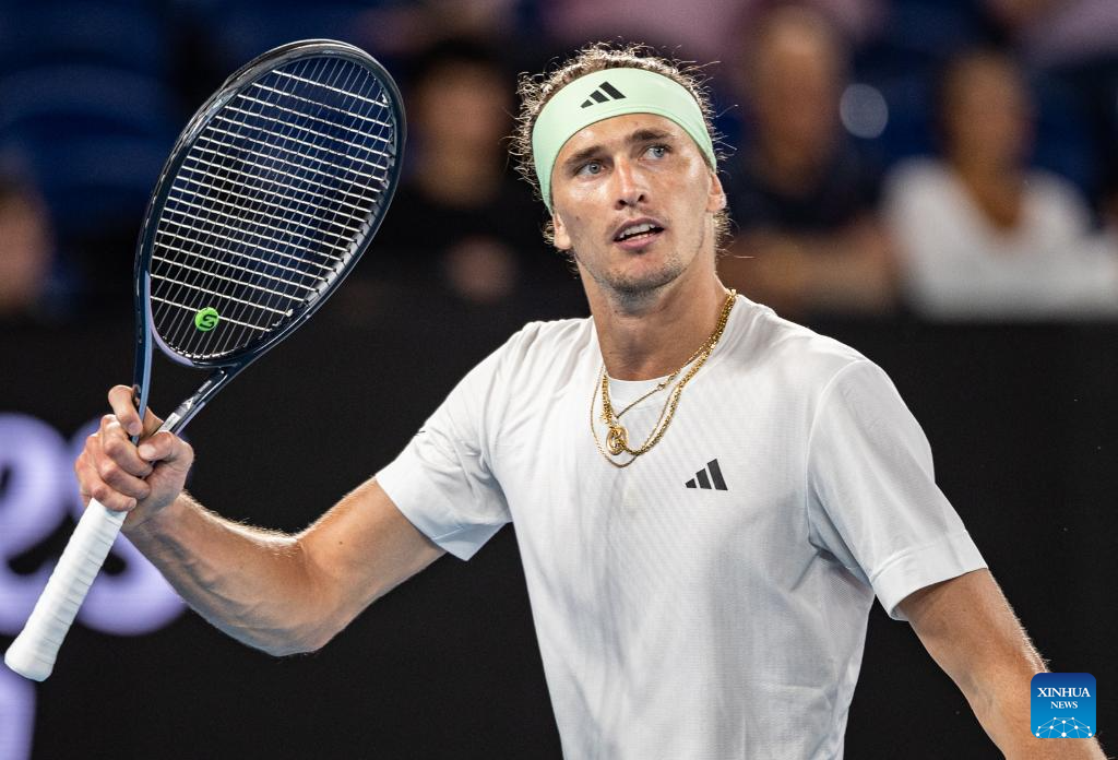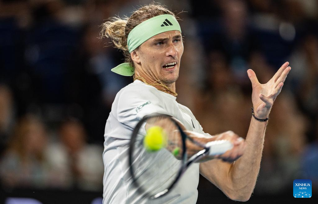 Alexander Zverev hits a return during the men's singles third round match between Alexander Zverev of Germany and Alex Michelsen of the United States at the Australian Open tennis tournament in Melbourne, Australia, Jan. 20, 2024. (Photo by Hu Jingchen/Xinhua)