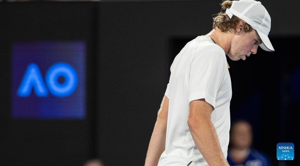 Alex Michelsen reacts during the men's singles third round match between Alexander Zverev of Germany and Alex Michelsen of the United States at the Australian Open tennis tournament in Melbourne, Australia, Jan. 20, 2024. (Photo by Hu Jingchen/Xinhua)