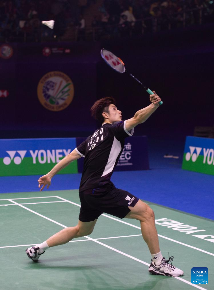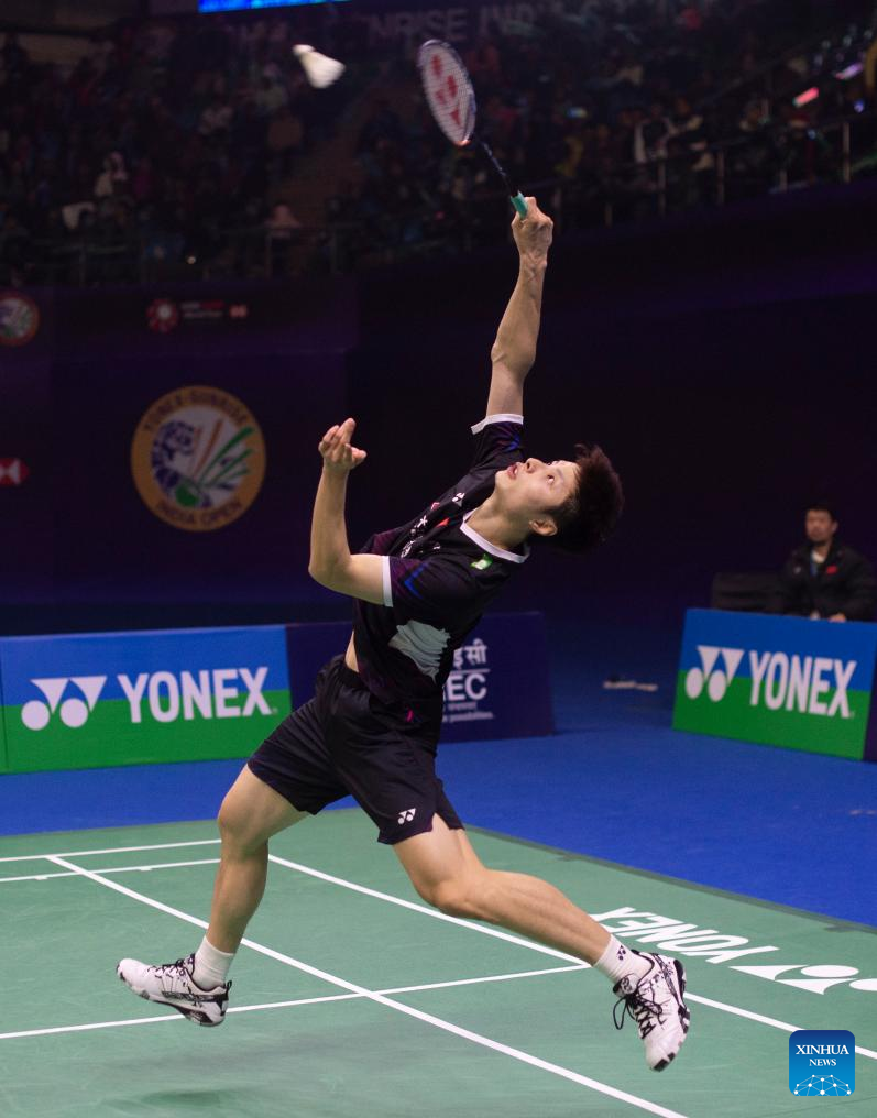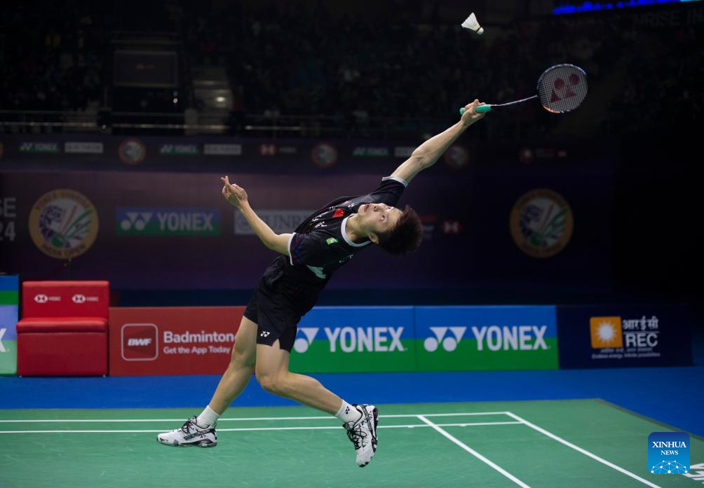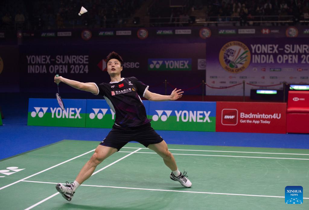 Shi Yuqi of China competes during the men's singles semi-final match against Prannoy H. S. of India at the India Open 2024 badminton tournament in New Delhi, India, Jan. 20, 2024. (Xinhua/Javed Dar)