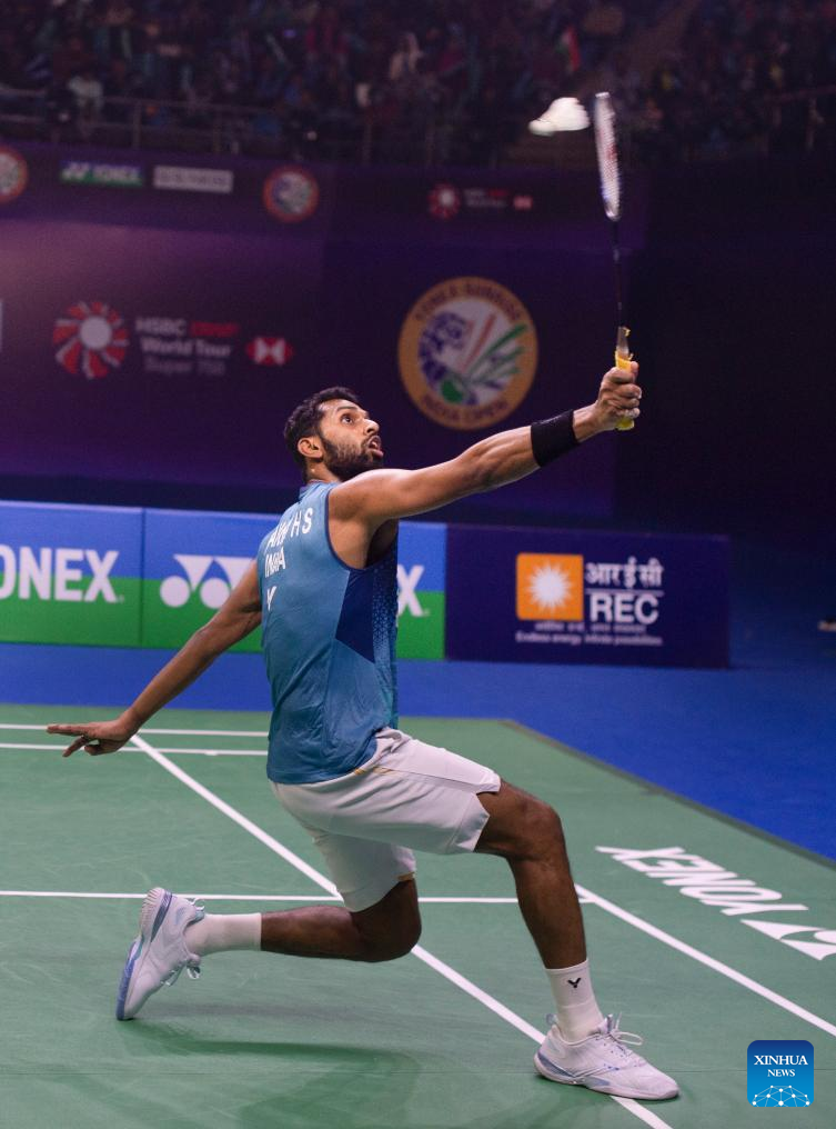 Prannoy H. S. of India competes during the men's singles semi-final match against Shi Yuqi of China at the India Open 2024 badminton tournament in New Delhi, India, Jan. 20, 2024. (Xinhua/Javed Dar)