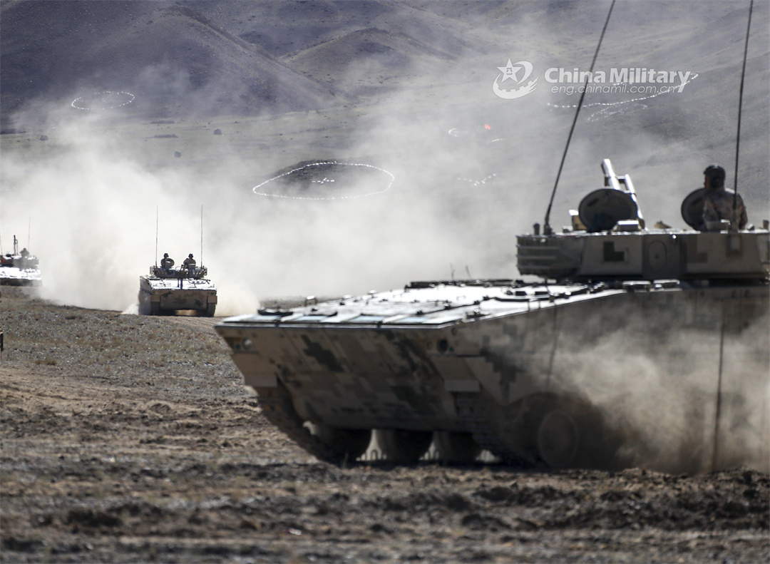 Infantry fighting vehicles attached to a brigade under the PLA 77th Group Army kick up plumes of dust during a comprehensive training exercise in plateau area on January 6, 2024. (eng.chinamil.com.cn/Photo by Huang Wei)