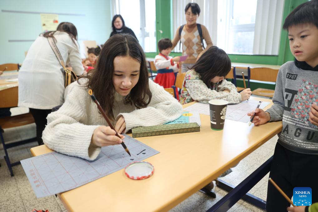 Students practice Chinese calligraphy during a China Day cultural event at Eurochine Chinese Language School in Brussels, Belgium, Jan. 20, 2024. (Xinhua/Zhao Dingzhe)