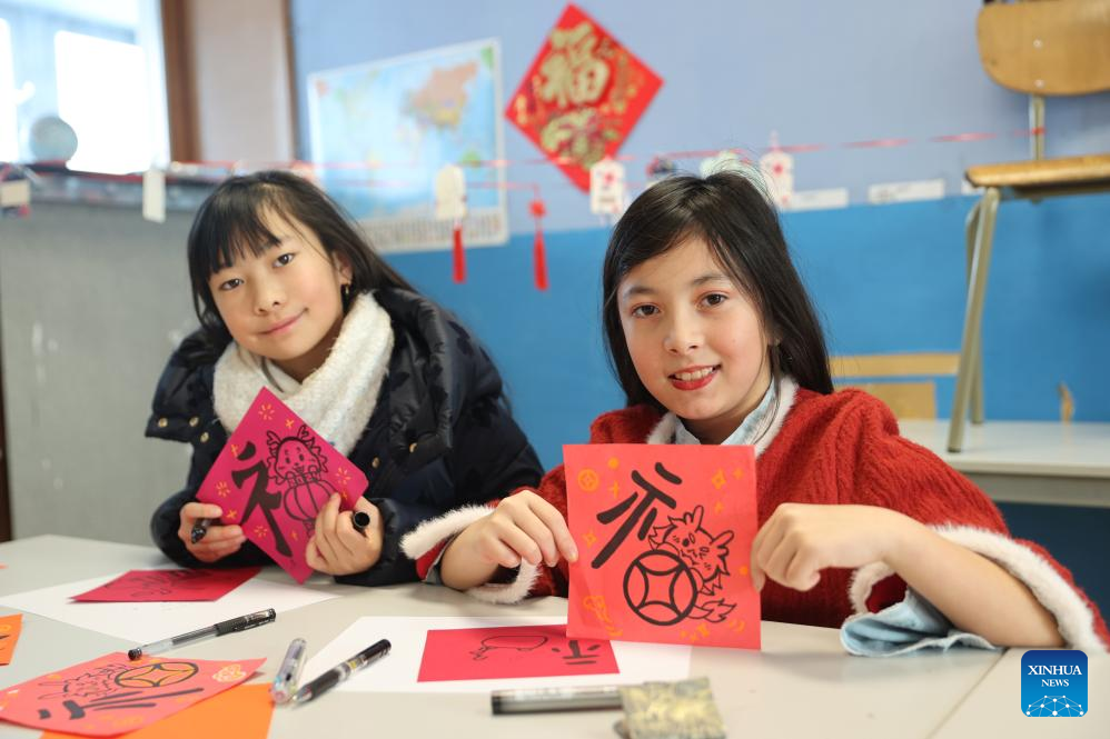 Students show their works of Chinese character "Fu", meaning fortune and luck, during a China Day cultural event at Eurochine Chinese Language School in Brussels, Belgium, Jan. 20, 2024. (Xinhua/Zhao Dingzhe)