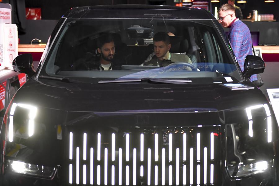Visitors check the interior of a vehicle from Chinese car brand Zeekr during the CarX exhibition-forum in Moscow, Russia, on Oct. 10, 2023. (Photo by Alexander Zemlianichenko Jr/Xinhua)