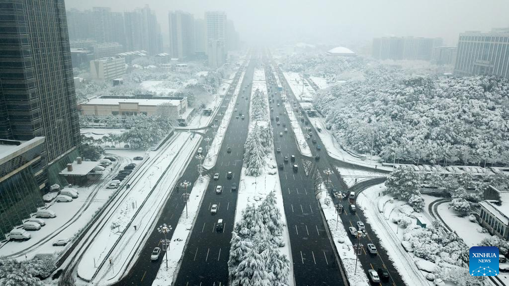 An aerial drone photo taken on Jan. 22, 2024 shows vehicles running on the road in Changsha, central China's Hunan Province. Changsha saw its first snowfall of 2024 from Sunday night to Monday morning. (Xinhua/Chen Sihan)