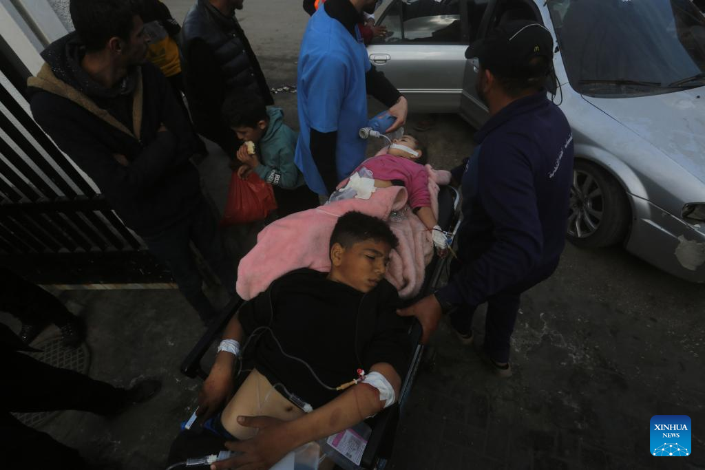 Injured children are transferred to a hospital in the southern Gaza Strip city of Rafah, on Jan. 23, 2024. The Palestinian death toll from the ongoing Israeli attacks on the Gaza Strip has risen to 25,490 since Oct. 7, 2023, the Hamas-run health ministry said on Tuesday. (Photo by Khaled Omar/Xinhua)