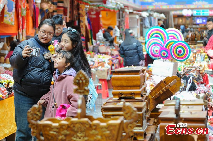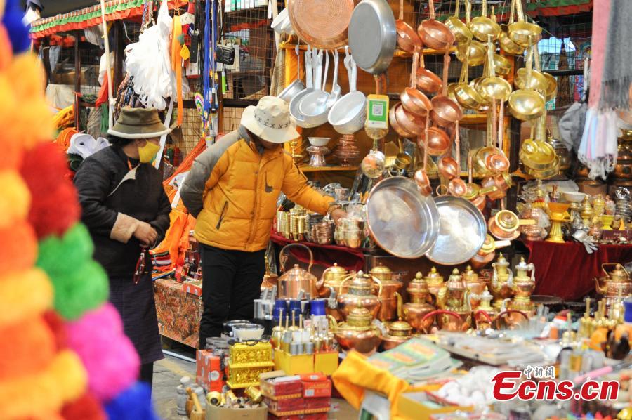 People shop at a bazaar on Barkhor Street in Lhasa, southwest China's Xizang Autonomous Region, Jan. 23, 2024. (Photo/China News Service)