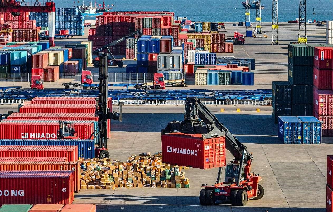 Containers are handled on a container yard of a port in Rongcheng, east China's Shandong province. (People's Daily Online/Li Xinjun)