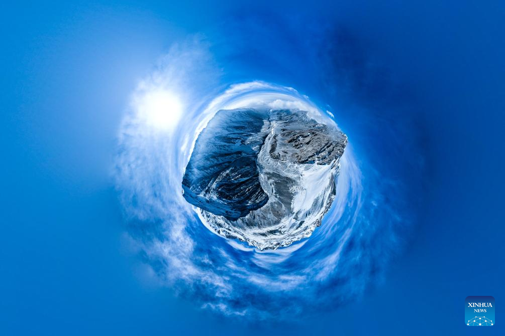 An aerial panoramic photo taken with a drone shows Mt. Gangshika in Menyuan Hui Autonomous County, northwest China's Qinghai Province, Jan. 23, 2024. (Xinhua/Zhang Long)