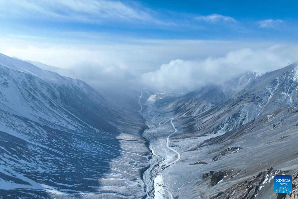 An aerial drone photo shows Mt. Gangshika in Menyuan Hui Autonomous County, northwest China's Qinghai Province, Jan. 23, 2024. (Xinhua/Geng Huihuang)